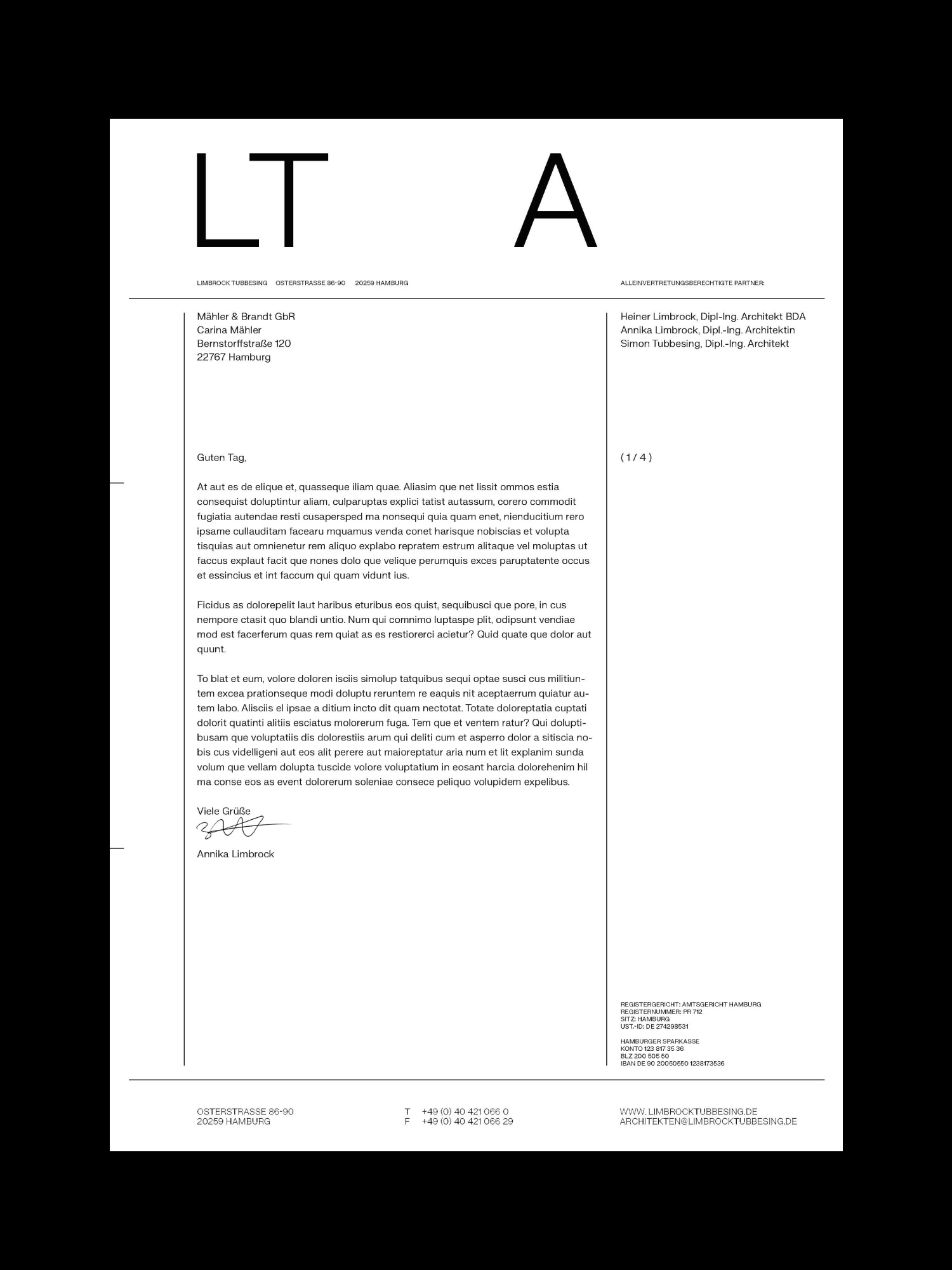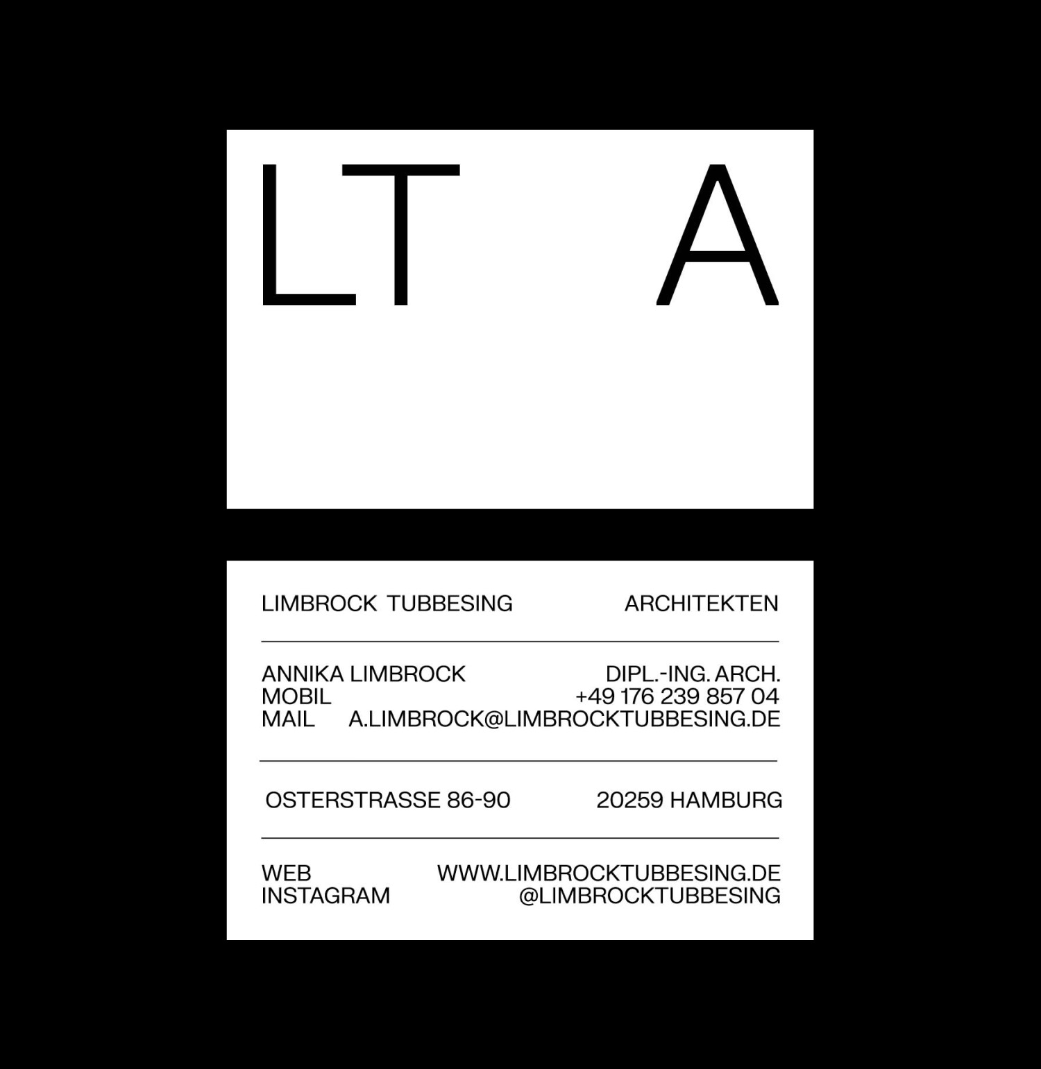 Für das Hamburger Architektur Büro Limbrock Tubbesing Architekten ist ein minimalistisches sowie typografielastiges Corporate Design entstanden. Der Einsatz von großflächigem Weißraum lässt Raum für die Wirkung der vielfältigen Projekte. Die Verwendung der Linie als primäres Gestaltungselement unterstreicht den Leitgedanken von Konsequenz in Konzept, Organisation und Objektplanung des Büros. Neben einer Website wurde die Geschäftsausstattung sowie diverse Printmedien gestaltet.