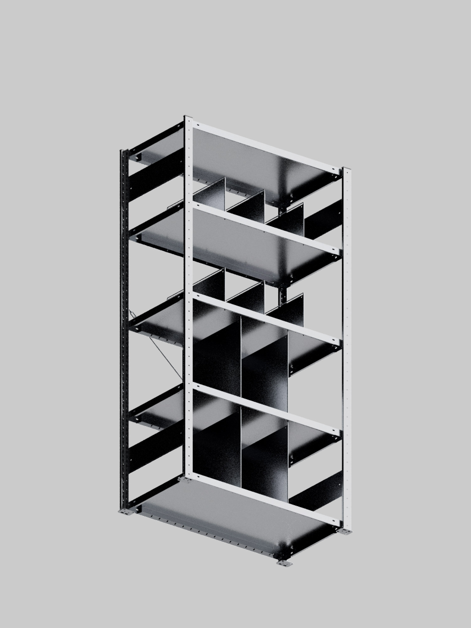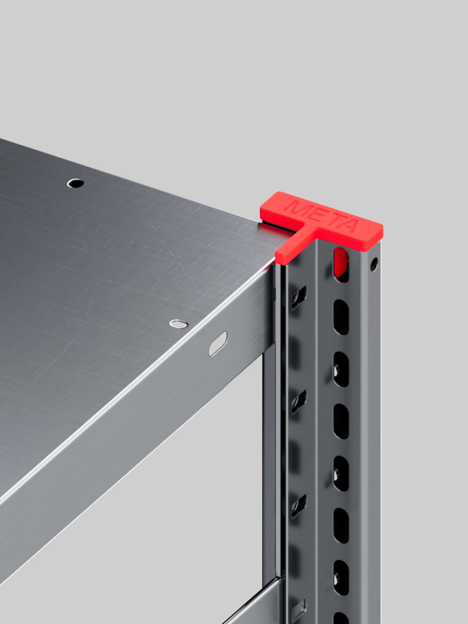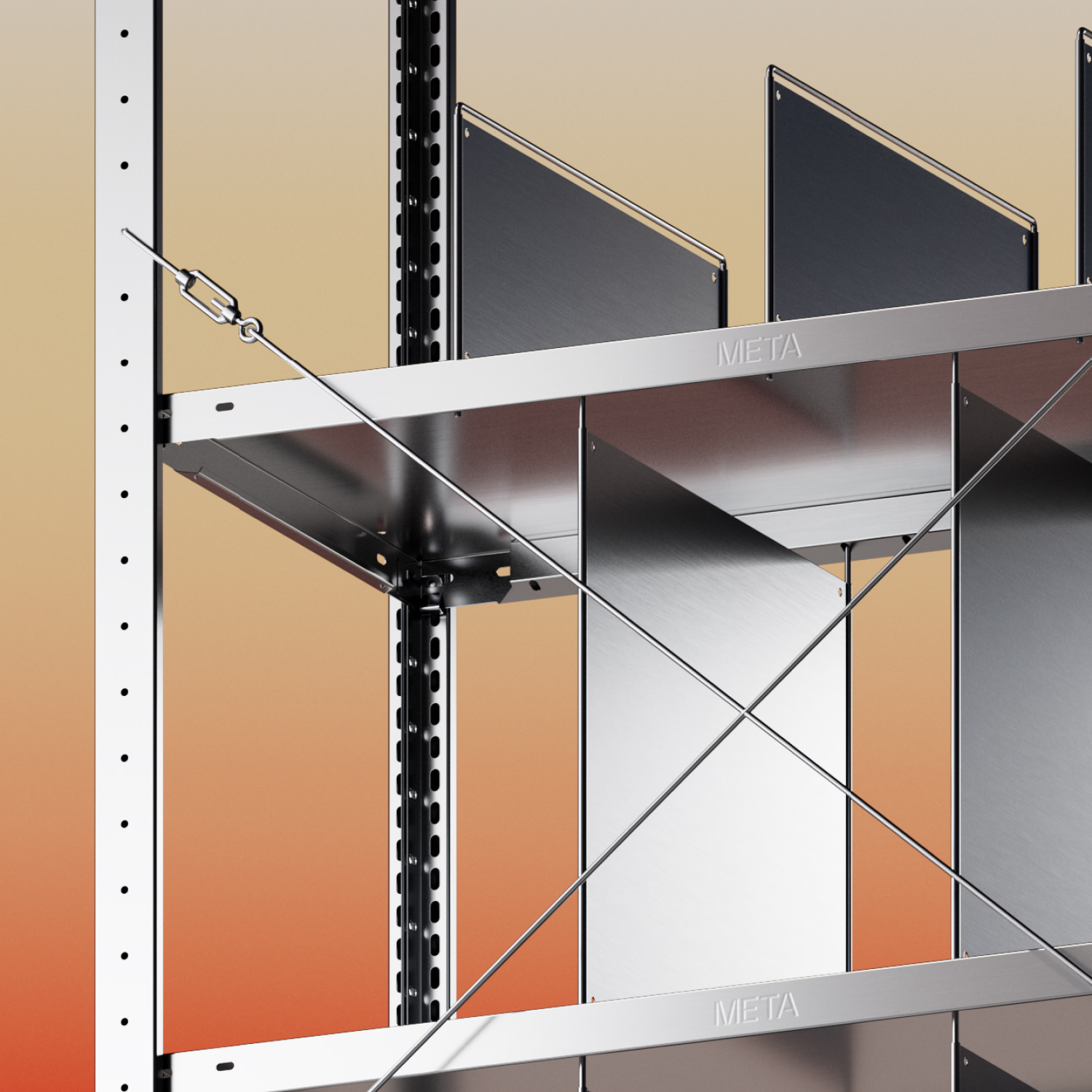 Für den Meta Regalbau wurden verschiedene Produktansichten entwickelt, die im Zuge des Brand-Relaunchs einen ästhetischen Blick auf die scheinbar brutalistischen Regalsysteme bieten. Dabei wurde besonderes Augenmerk auf die Lichtstimmung und Perspektive gelegt, um die Robustheit der Strukturen in einem neuen Licht erscheinen zu lassen und gleichzeitig eine elegante Atmosphäre zu schaffen.